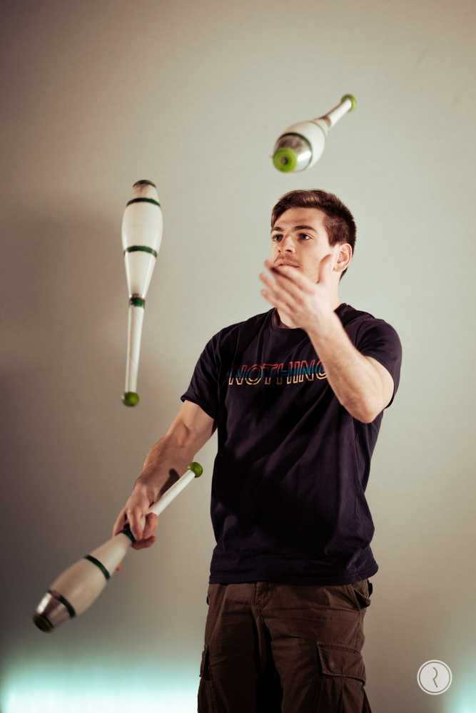 Un viso imperturbabile, anche nel momento in cui un oggetto sfugge alla presa, rotolando lontano; come un abile domatore che fa schioccare la frusta e atterrisce le belve, Marco non si scompone e riprende in mano la situazione; con una piroetta, afferra la pallina ribelle e la rilancia: the show must go on.